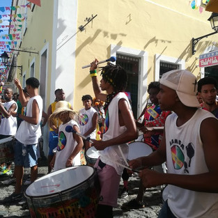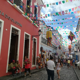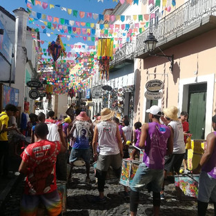 L'ambiance y est festive: capoeira sur les places et école de samba dans les rues (notamment l'école Olodum, mondialement connue depuis le clip de Mickael Jackson "They don't care about us" tourné dans la favela Santa Marta de Rio). Ce n'est pas pour rien que le carnaval de Salvador est aussi réputé que celui de Rio, avec en plus, la culture et les traditions africaines. Mais fin juin je ne venais pas assister au carnaval sinon à la "festa junina" (fête du mois de juin, célébrant Saint Jean). Pour l'occasion les filles se maquillent les joues avec de fausses taches de rousseurs et portent des couettes tandis que les garçons portent des chapeaux de paille, ceci faisant ainsi référence à la tradition car la fête était autrefois davantage célébrée dans l'intérieur du pays par les ruraux (caipiras). On danse le quadrille et le forró et on lance des bombinhas dans les rues (des petits pétards). Alceu Valença, chanteur brésilien très connu est venu enflammer Salvador le 23 juin. Le lendemain entre deux show, je me retrouverai enfermée à clés dans un magasin, emportée par la foule. On peut dire que j'aurais vécu la fête à la brésilienne. Quelques minutes plus tard les portes rouvrent et les gens sortent au compte goutte, du jamais vu.